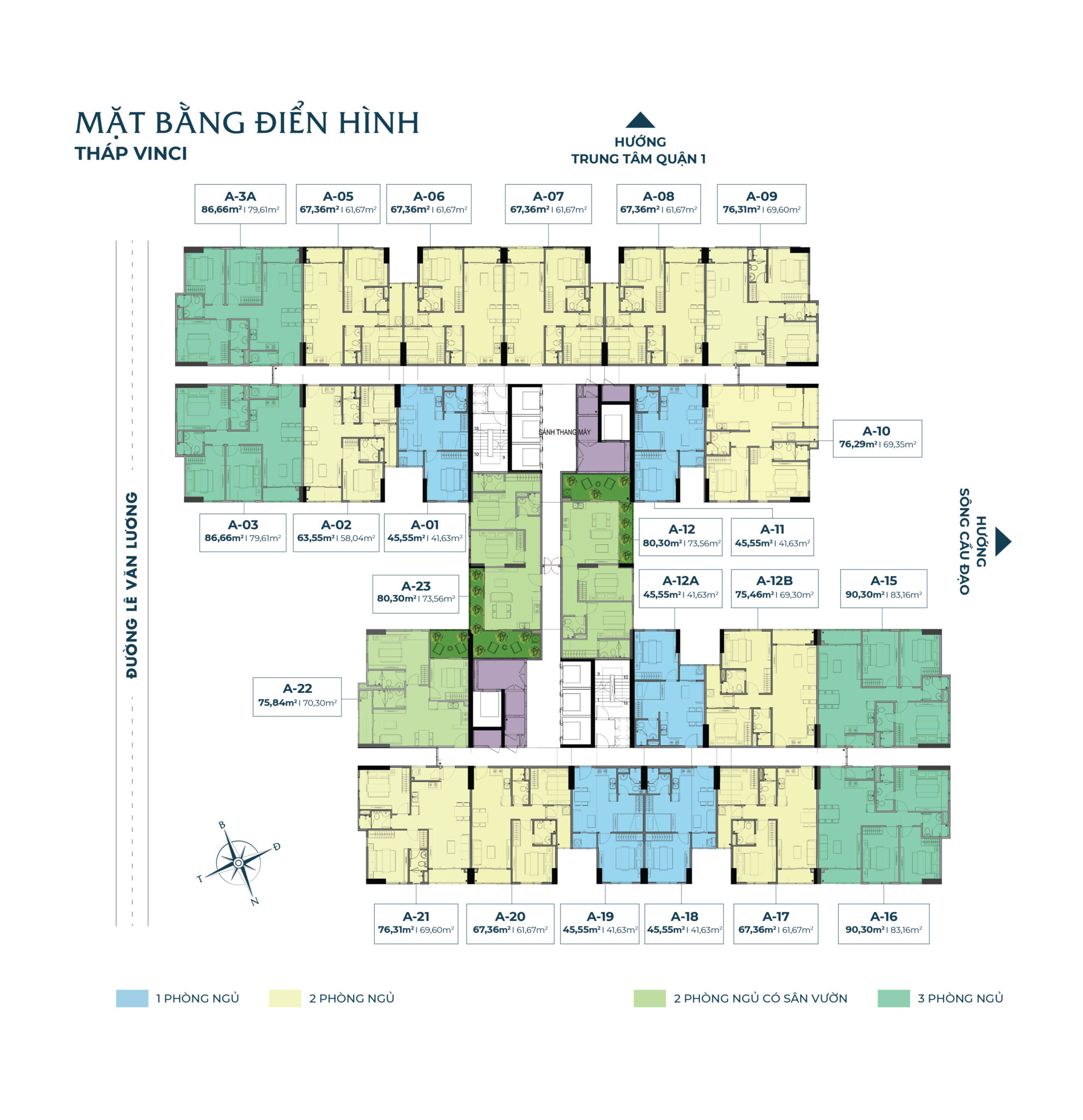 + Căn hộ 2PN với diện tích 55,4 – 62,75 – 63,5 – 67,2 – 76 m2 và căn hộ sân vườn 80m2.